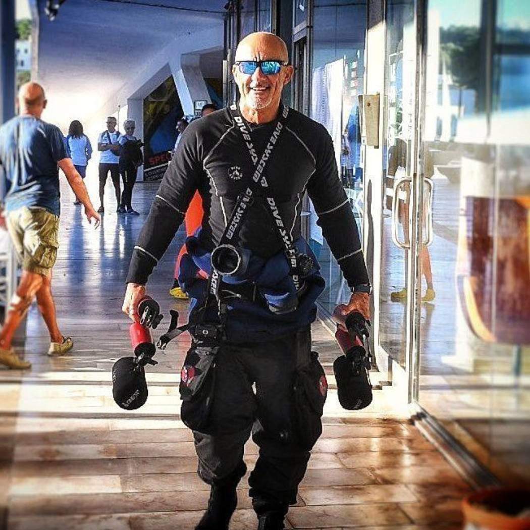 Una vita vissuta nel segno dell’acqua che, lo ha visto prima come operatore subacqueo in basso fondale poi come accompagnatore subacqueo per il Club Vacanze e infine guida sub alle Maldive. Da sempre appassionato di fotografia subacquea, nel 1966 inizia la sua avventura nel mondo delle gare con la cacciafotosub oggi Safari.