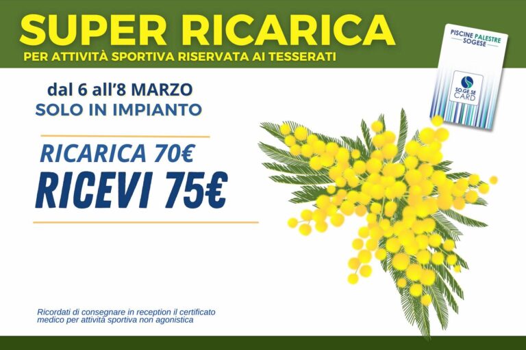 Dal 6 all’8 marzo 2026 scopri in piscina la nostra super ricarica! Solo in impianto potrai ricaricare 70€ e ricevere subito ulteriori 5€ in omaggio